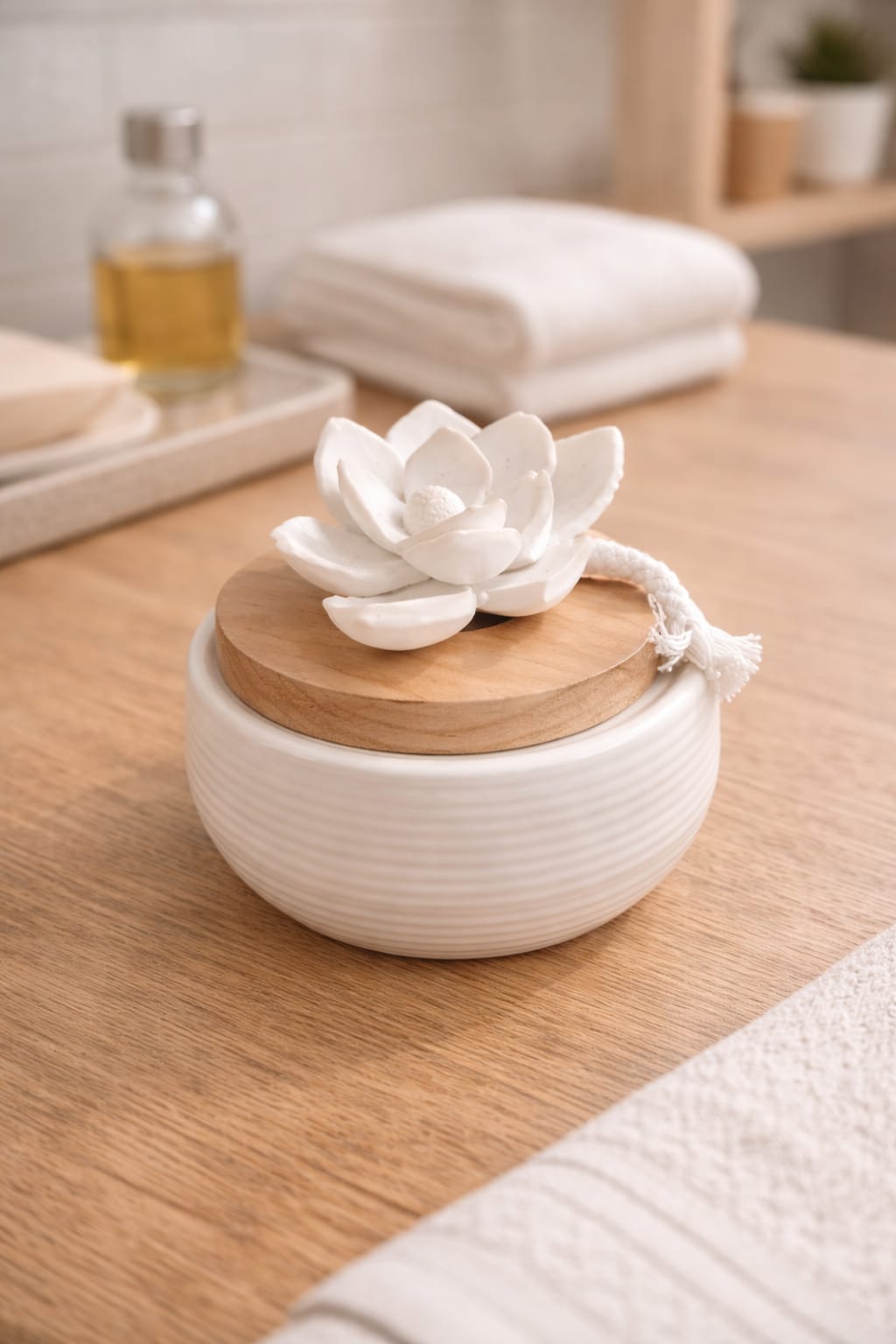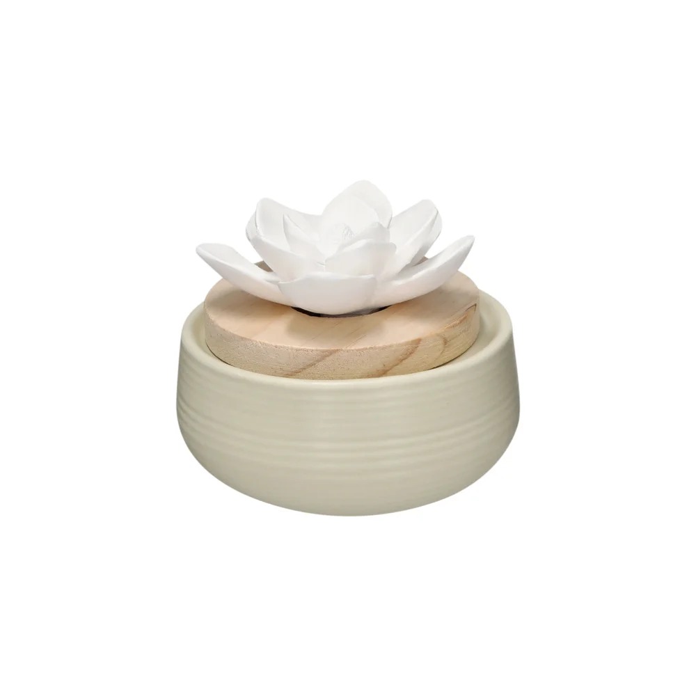Difusor de aromas de cerámica y madera para aromatizar los ambientes. Tiene un olor de Durazno y hojas de té