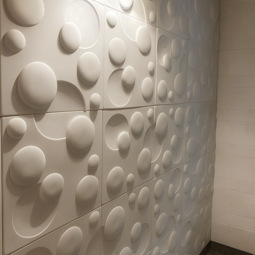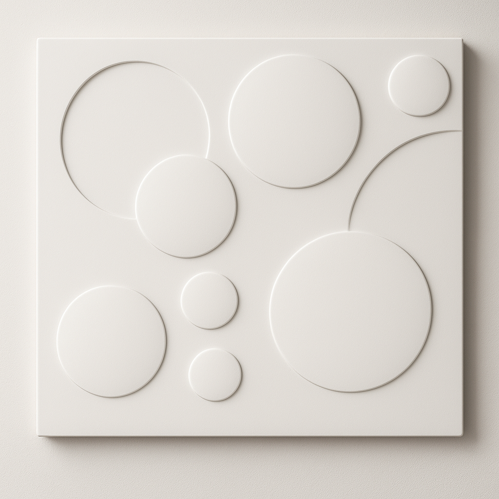 El modelo Eclipse 3D presenta un diseño geométrico con círculos superpuestos que generan profundidad y un juego visual equilibrado. Su relieve suave aporta dinamismo y un toque artístico a cualquier ambiente contemporáneo.